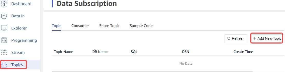Open the Explorer interface of the source cluster, click the "Data Subscription" menu on the left, then click "Add New Topic".