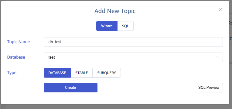 Create the required Topic in the source cluster, which can subscribe to the entire database, supertable, or subtable. In this example, we demonstrate subscribing to a database named test.