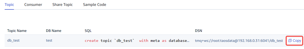Click the "Create" button, return to the topic list and copy the DSN of the topic for later use.