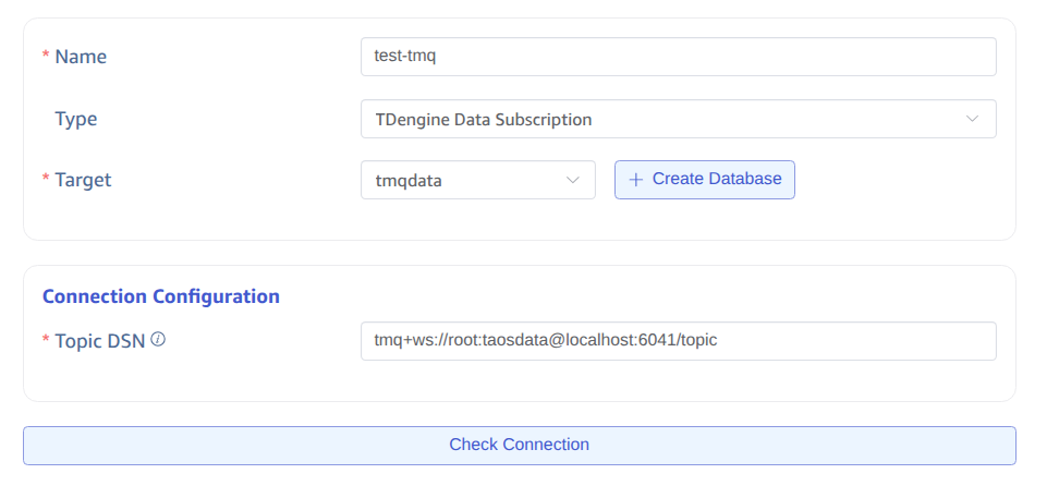 - Paste the DSN copied in the preparation step into the Topic DSN field. For example: tmq+ws://root:taosdata@localhost:6041/topic