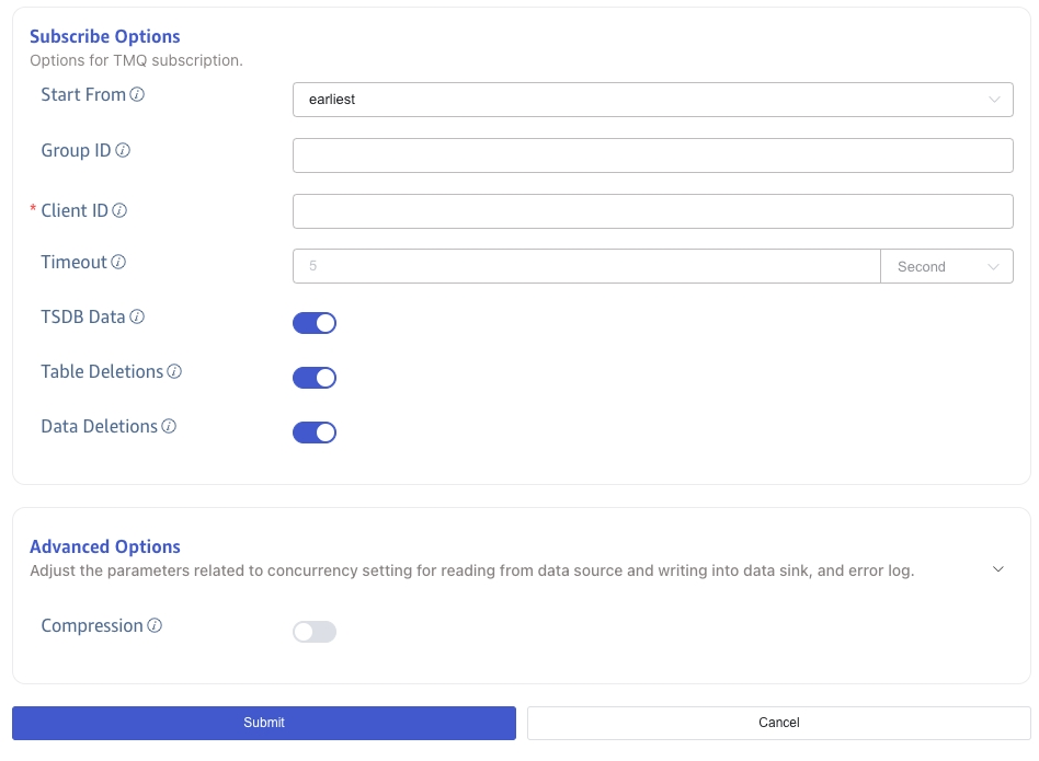 , in this case, there is no need to create a Topic in advance, taosX will automatically recognize that a database name is used and automatically create a subscription Topic in the source cluster. - FROM DSN supports the group.id parameter, to explicitly specify the group ID used for subscription. If not specified, a randomly generated group ID will be used.