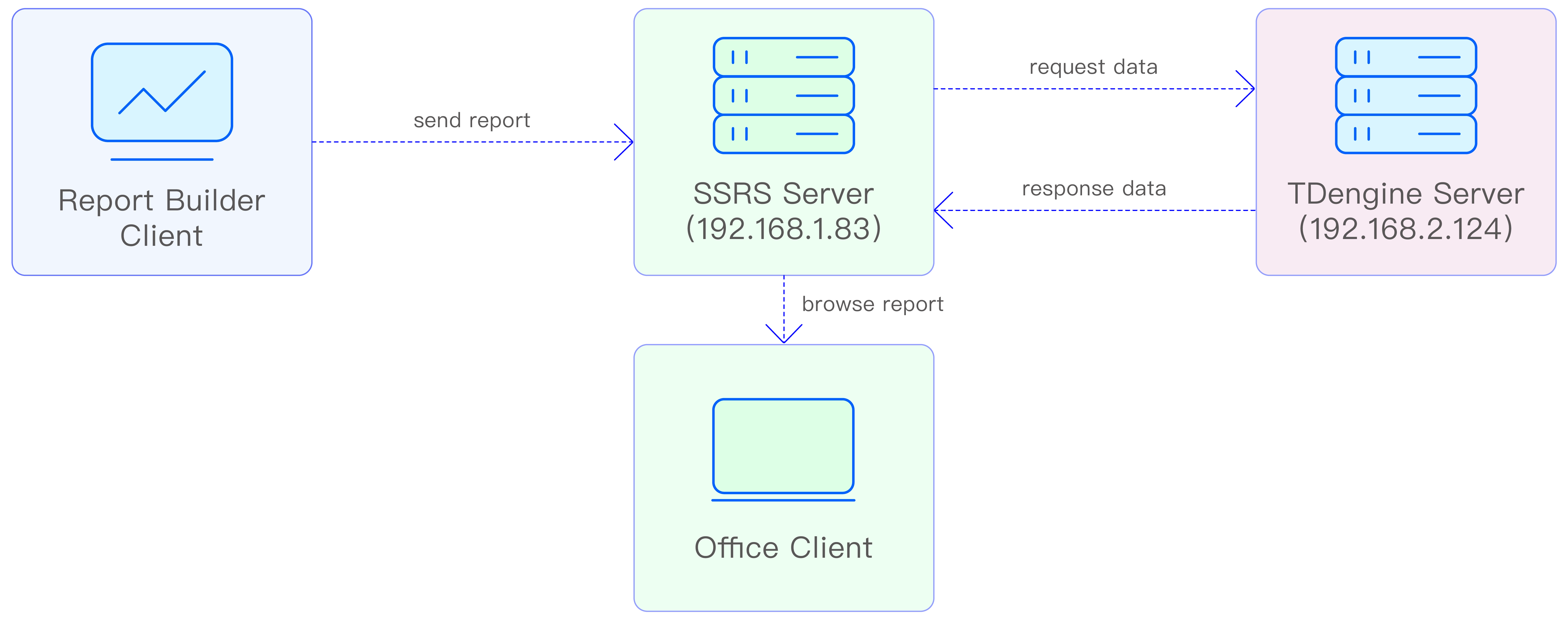 SSRS seamlessly connects to TDengine, which supports standard ODBC interfaces. TDengine's high-performance data storage and query capabilities provide a real-time data source for the SSRS reporting engine, while the SSRS visual report generator function transforms time-series data such as IoT and financial data into intuitive business insights to meet the needs of enterprises for a cross-platform reporting solution. The SSRS visual report generation function transforms time-series data from TDengine, such as IoT and finance, into intuitive business insights, meeting the enterprise's need for a cross-platform reporting solution, while safeguarding the security and stability of data interactions through a standardized interface, providing solid technical support for the construction of modern data-driven organizations.