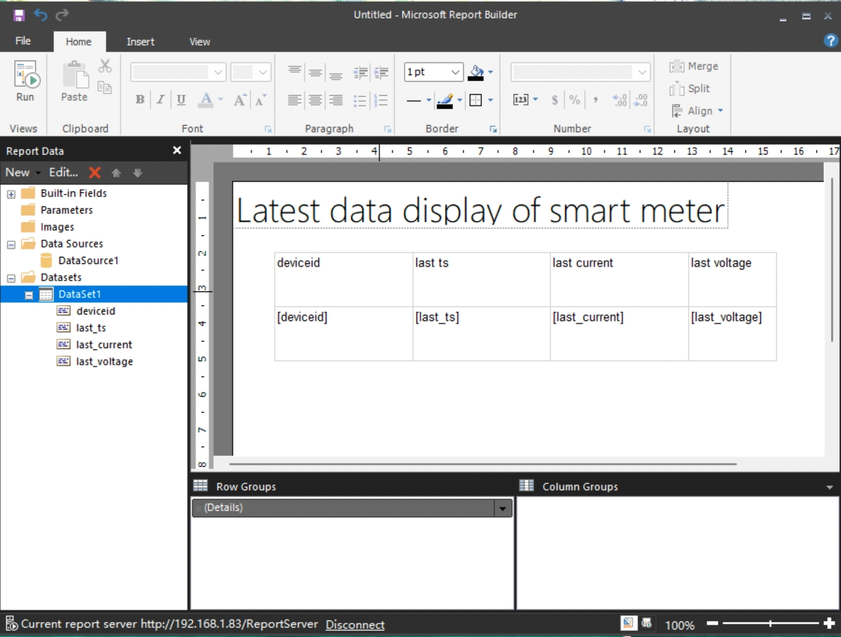 Create the report page. Menu "Insert" -> "Table" -> "Insert Table", insert an empty table, use the mouse to drag the data columns of "DataSet1" to the right side of the report. "DataSet1" in the data columns with the mouse dragged to the right side of the report production area placed on the columns they want to show, as shown: