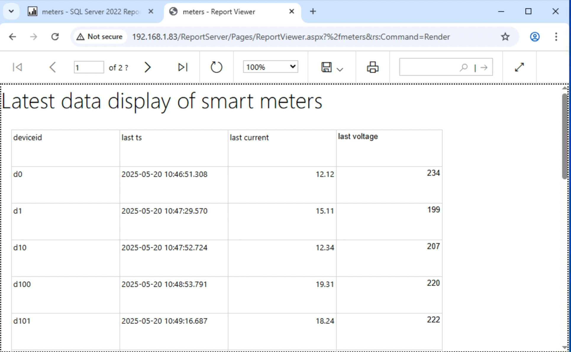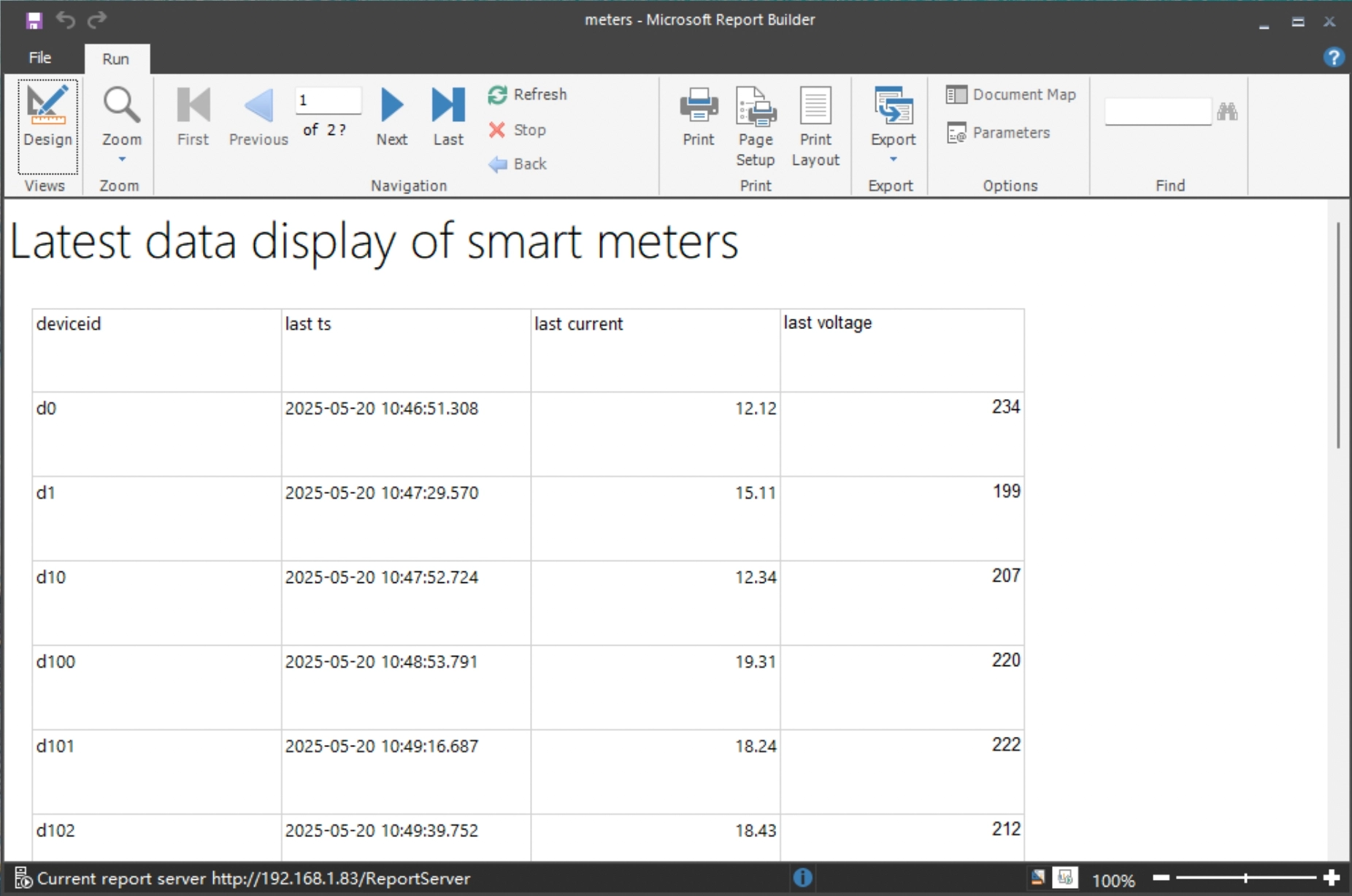 There are 500 smart meters in a community, and the data is stored in the TDengine database. The electric power company asks the data operation department to create a report that can browse the last reported voltage and current values of each smart meter in the community in a page by page to analyze the electricity consumption of the residents, and at the same time, it is requested that the report can be browsed by logging in to any of the office computers in the company.