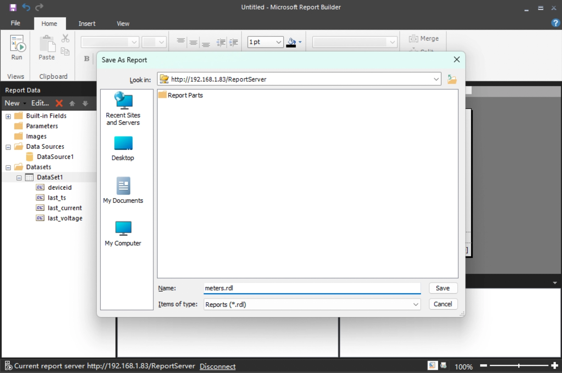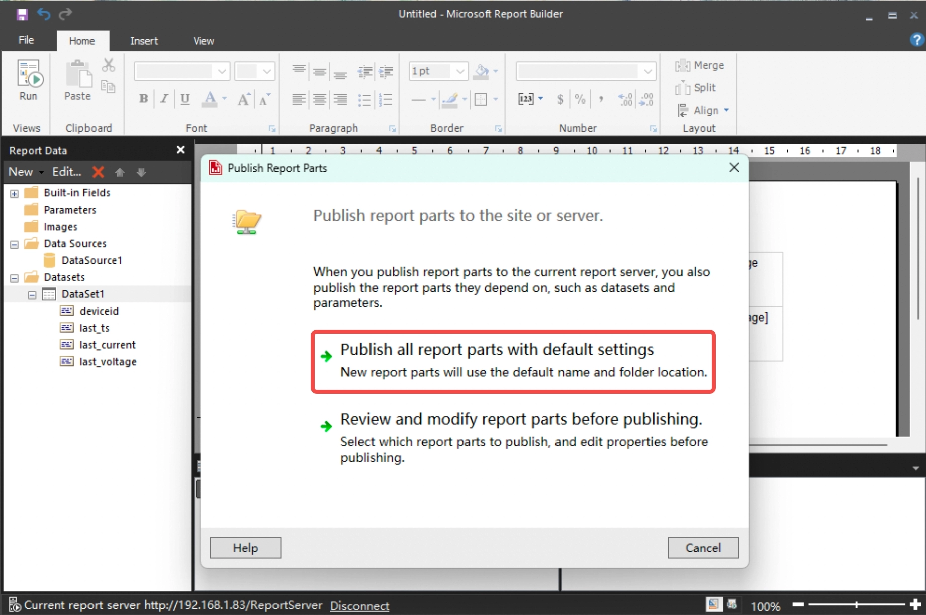 Create data source connection on Report Builder Client. Start Report Builder, right-click on the "Data Source" item in the left area and click "Add Data Source..." menu, as shown in Figure:
