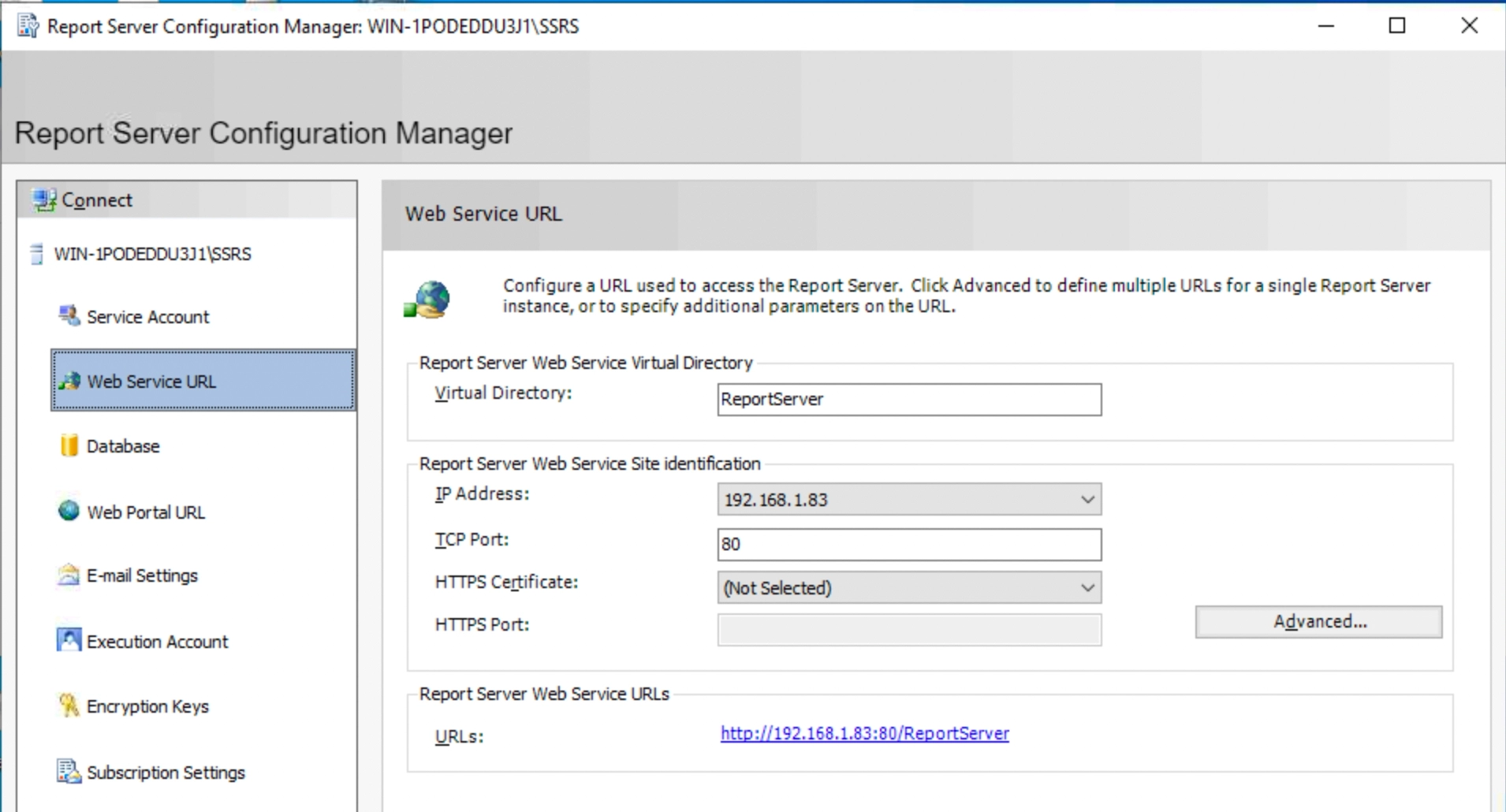 Record the "Report Server Web Service URLs" address in the above figure, which will be used in the following steps.